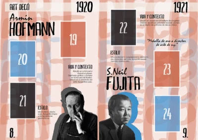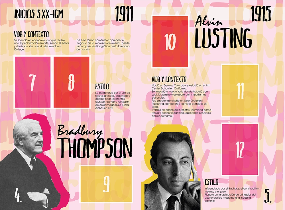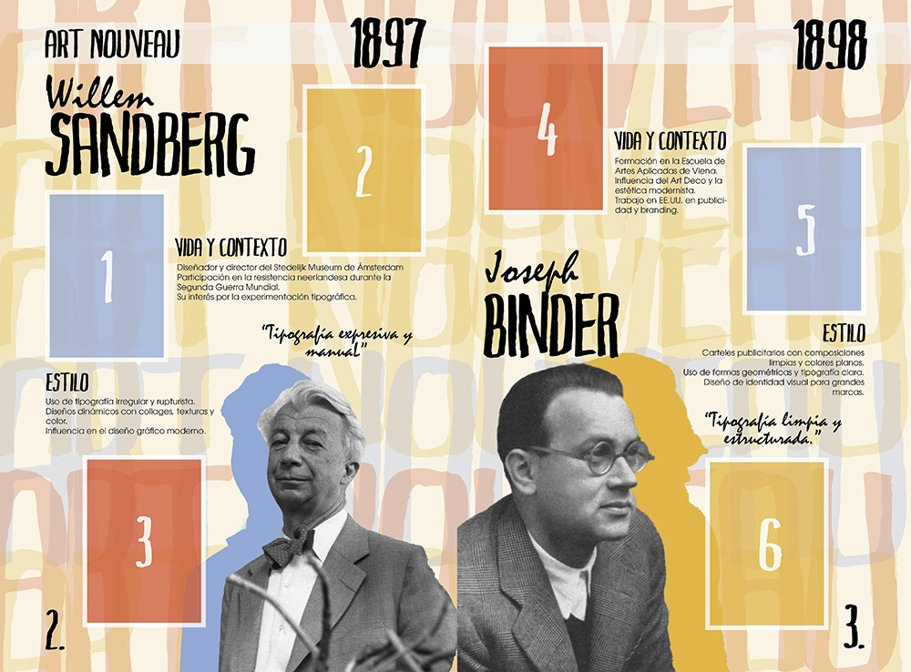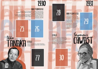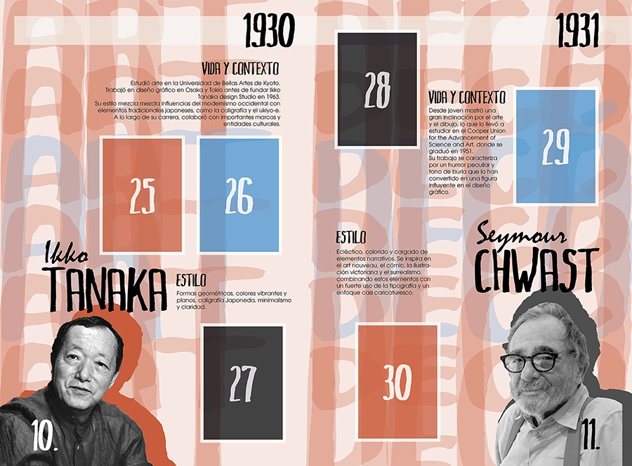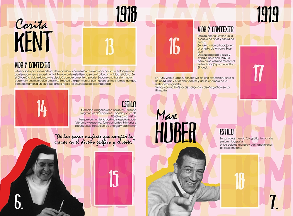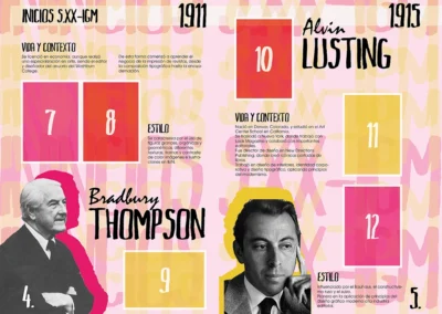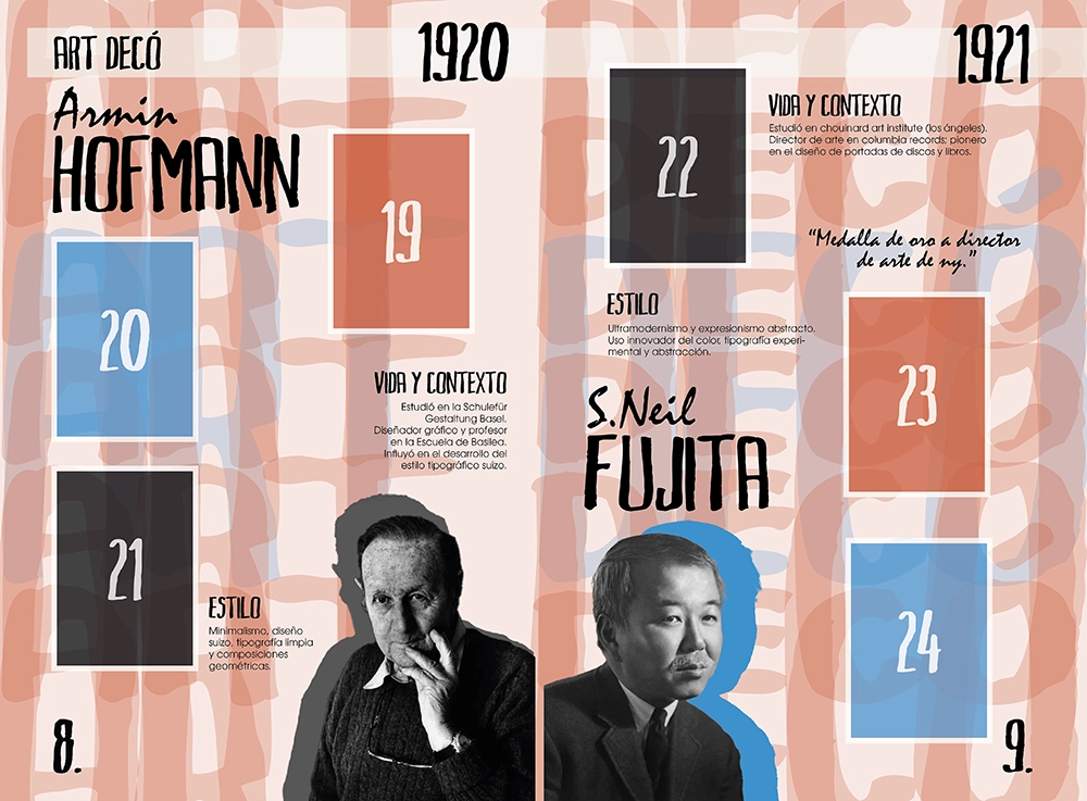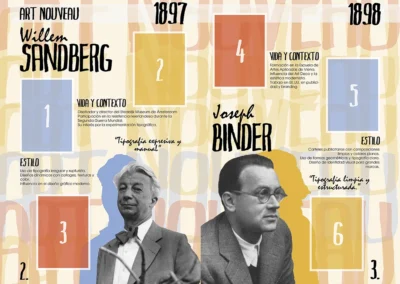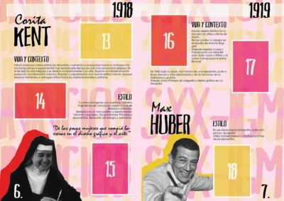 Este diseño que realicé para la asignatura de historia del diseño en 3ro de carrera, trataba de hacer un álbum de cromos de diseñadores gráficos. He escogido un estilo que mezcla tipografías manuales con tipografías planas, y he sacado una paleta de colores para cada época.